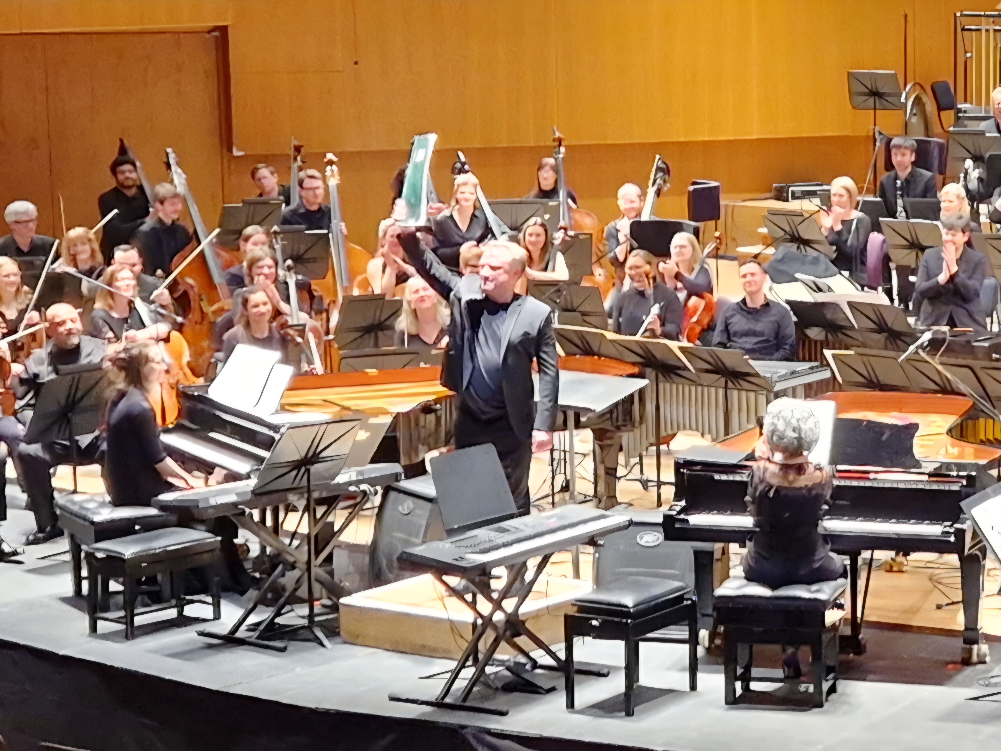Colin Currie brandishing the score of Steve Reich’s The Four Sections