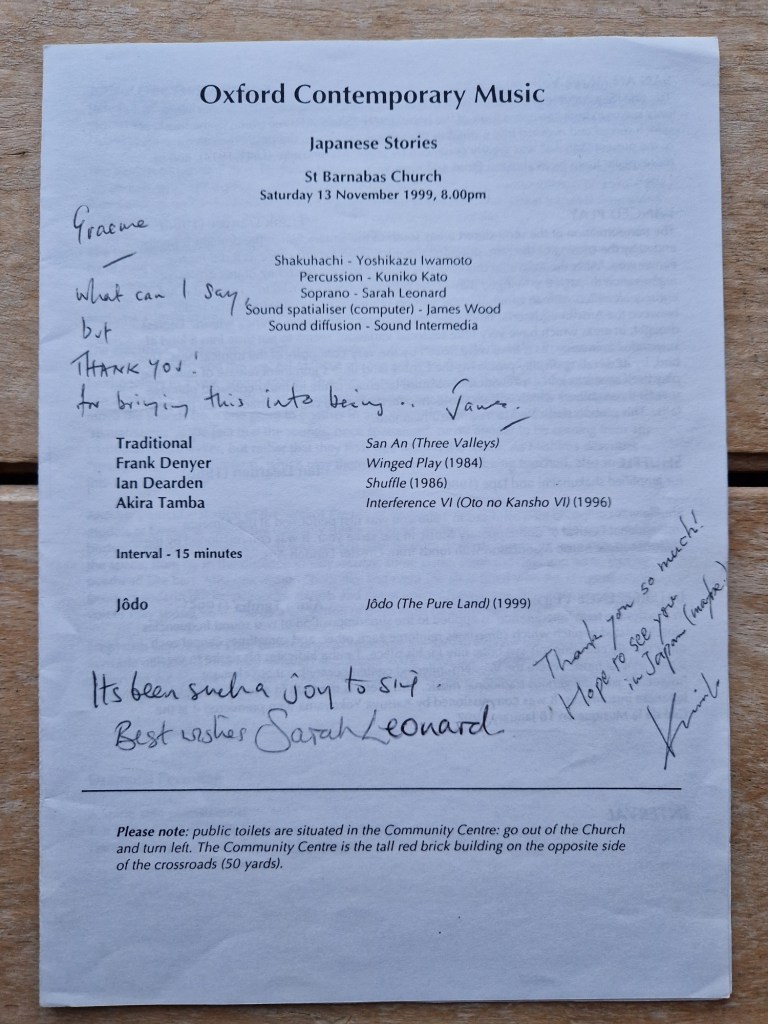 And once, just once (so far, anyway) I joined this illustrious company. This was back in the 1990s. I was working in Hong Kong with a good salary for the first time in my life, and through a friend of mine, Pippa Hyde, I commissioned a work from the percussionist and composer James Wood. The result was Jodo, a music theatre piece for soprano, percussion and electronics premiered in Oxford in 1999 with Kuniko Kato, the brilliant Japanese percussionist for whom it was written, and the soprano Sarah Leonard. I was always a great admirer of Sarah Leonard and was very sad to hear of her death last year.